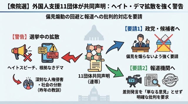 共同声明では、▼各政党や候補者に外国人への偏見を煽らないよう求めたほか、▼報道機関に対しても、デマやヘイトスピーチについて“ひとつの意見”として扱わず、明確に批判するよう求めました。