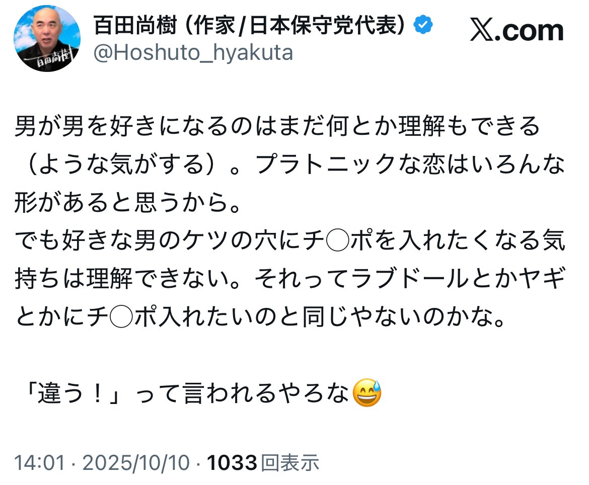007 | 名無しさん | 2025/10/10(金) 19:47:35 | そして百田はお下劣ポストして速攻削除 消 | 画像 |
