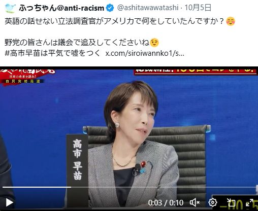 高市さん、「英語の話せない立法調査官がアメリカで何をしていたんですか?」という庶民の素朴な疑問に答えてくださるといいんですが。