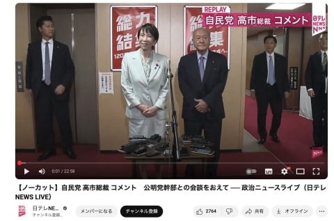 問題の音声が入っていたのは、高市氏が公明党関係者との会談を終え、報道陣の取材に応じる場面をライブ中継していた日本テレビの映像だ。
