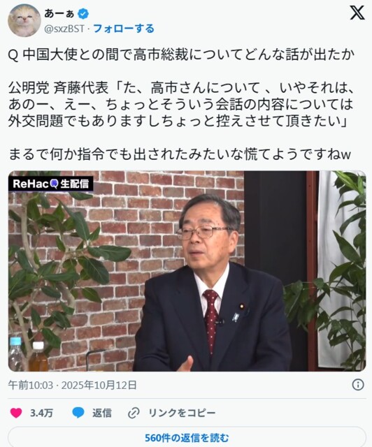 スレッドタイトル:公明党・斉藤代表 連立離脱直前に中国大使と面会
