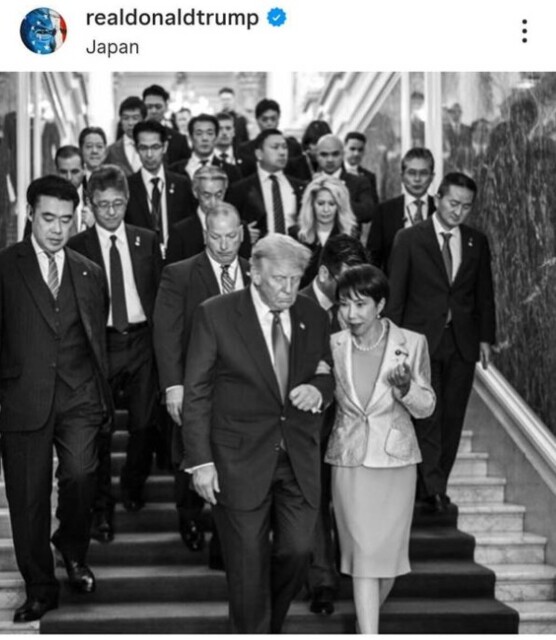 トランプ氏が韓国に向けて日本を出発した29日にインスタグラムで投稿したのは、モノクロのショット。トランプ氏と高市首相が腕を組み、階段を降りている。