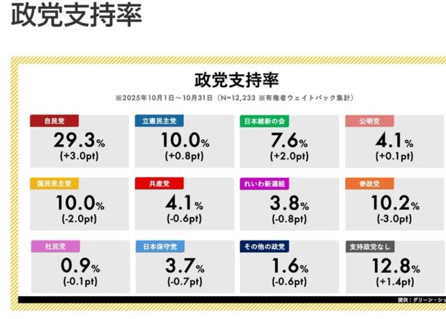 メディアや統一教会思考停止奴隷を動員して、必死に高市自民の人気が上がるように下手な工作をしていますが、意外と伸びが無い。