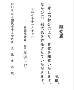 スレッドタイトル:【速報】NHK党・斉藤参院議員が離党表明