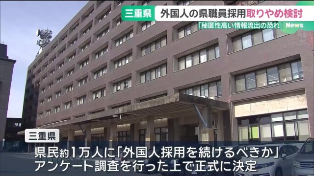 三重県が、外国人の県職員採用を取りやめる方向で検討を始めたことが24日、県への取材で分かった。秘匿性の高い情報の流出防止が目的としており、採用の「国籍要件」を復活させる考え。近く県民約1万人を対象にアンケートを実施して外国人の採用を続けるべきかを尋ね、その結果などを踏まえて最終的に判断する。