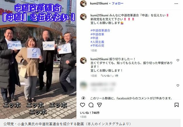 1月19日までに、公明党所属の宇都宮市議会議員の小倉久美氏が自身のXを更新。新たに発足した『中道改革連合』としての思いを綴ったが、添えられた動画が物議を醸している。