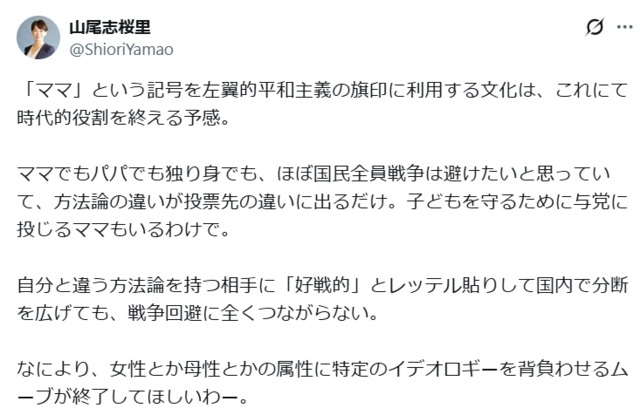 そのうえで、「『ママ』という記号を左翼的平和主義の旗印に利用する文化は、これにて時代的役割を終える予感」と書き出し、「ママでもパパでも独り身でも、ほぼ国民全員戦争は避けたいと思っていて、方法論の違いが投票先の違いに出るだけ。子どもを守るために与党に投じるママもいるわけで」と指摘。