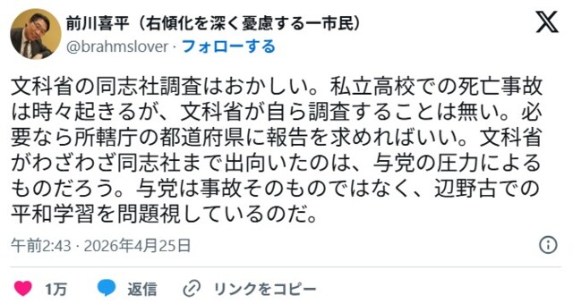 前川氏は「私立高校での死亡事故は時々起きるが、文科省が自ら調査することは無い」「文科省がわざわざ同志社まで出向いたのは、与党の圧力によるものだろう。与党は事故そのものではなく、辺野古での平和学習を問題視しているのだ」と投稿し、政府・与党を批判しています。